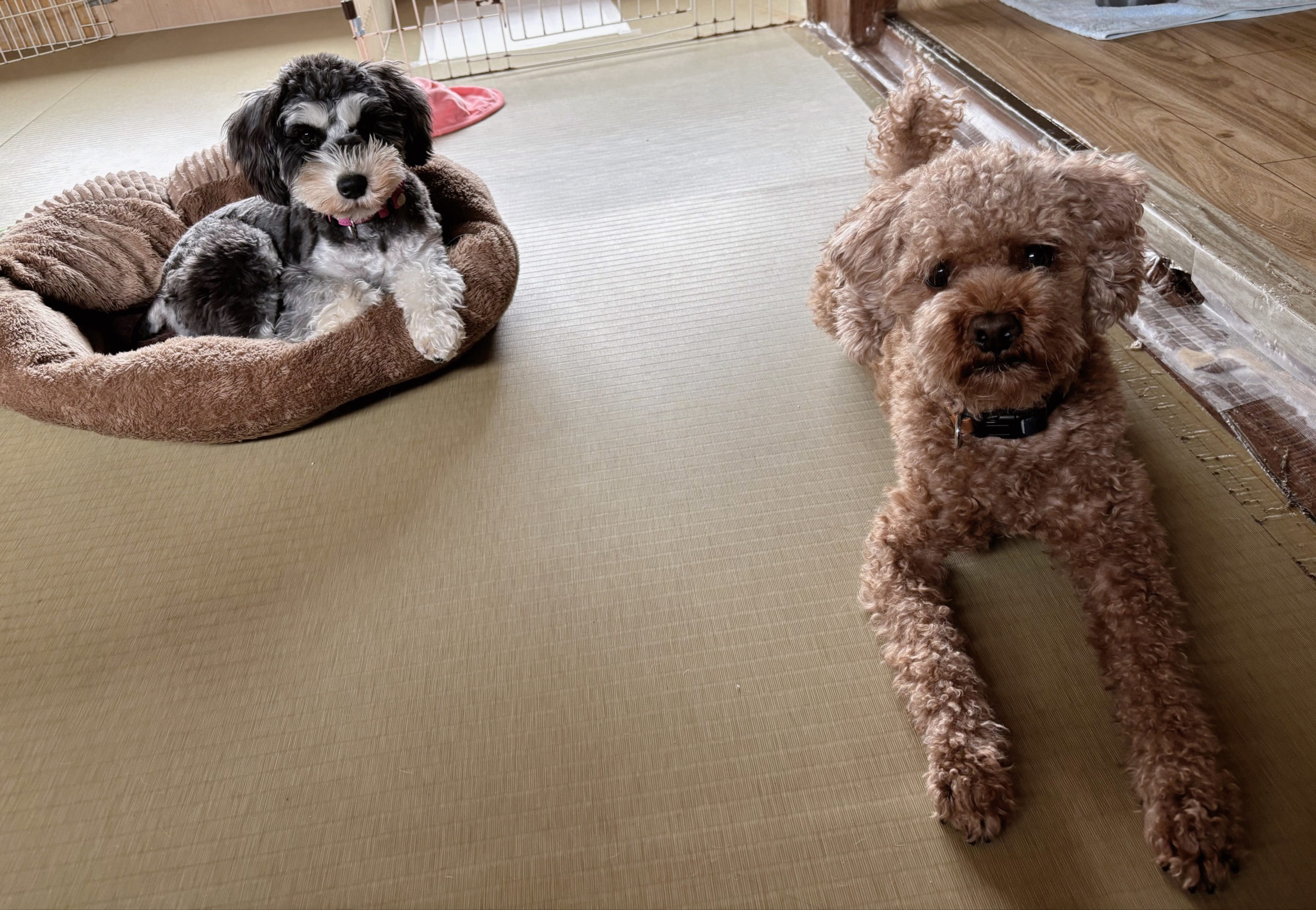 シュナちゃんはベッドにすっぽりとおさまり、トイプーちゃんは、グイーンと身体を伸ばしてストレッチして、そのまま伏せの体勢で小休止。お二人とも、基本はお元気ヤングチームなのですが、時にはこうしてお休みすることだってありますよ、という所を見せているかのような(笑)リラックスムードもたっぷりで、お互い安心しきっている表情です。滞在も長いため、お部屋がすっかり自分たちの場所、という風になっているらしく、時には無防備な格好で寝ていたりもして(笑)人間としては嬉しいかぎりですね。