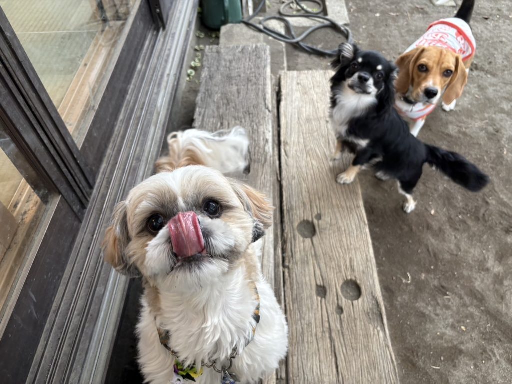 立派なペロをご披露しながら、クリクリおめめで見つめるシーズーちゃん。うしろにも、散策を終えて戻ってきたチワワちゃんやビーグルちゃんも。それぞれのお庭タイムを満喫したようで、そろそろ一旦お部屋に戻ろうかな、というところ。皆さんわんこのうちは慣れっこさんたち、枕木ゾーンにくれば、自動的に窓が開き(笑)お部屋に戻れることをちゃんと知っているのです。