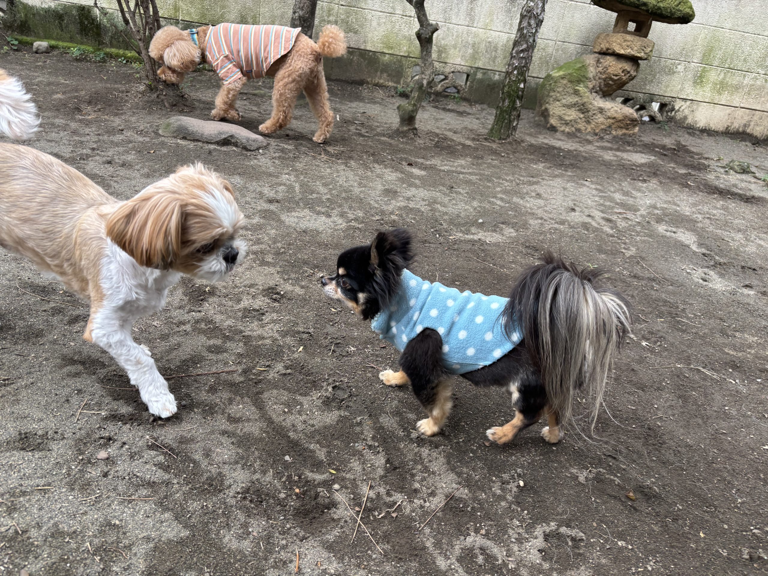 お互いチェックができたら、またそれぞれのペースで散策再開、チワワちゃんはいろんな所を入念にクンクンしながら、シーズーちゃんは時折立ち止まってみんなの様子を観察しながら、各々のお庭タイムを過ごしておりました。キリッと冷たい風も、わんこたちの頭や身体をシャキーンとさせてくれるので、お外タイムは大切ですねー。