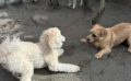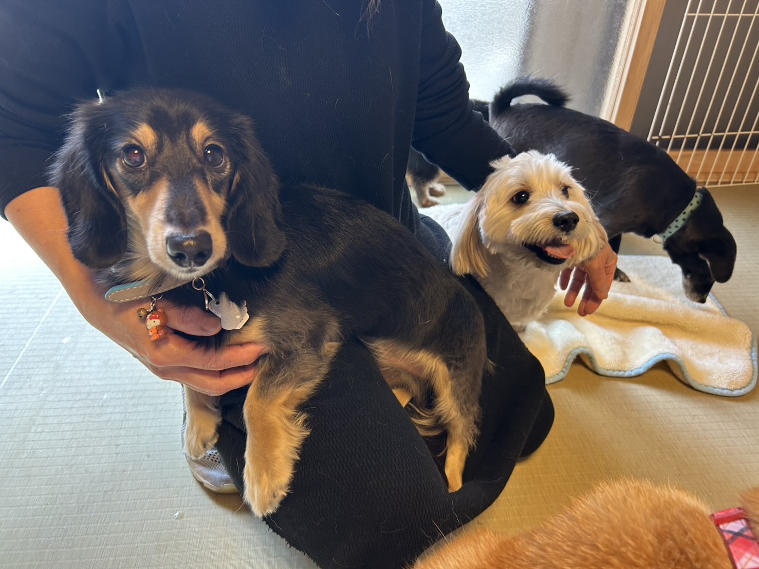 しっかりと人間のお膝を確保していたダックスちゃん、「もうここから動きません。」という硬い意志も感じられるほど(笑)わんこ同士の交流にはかなり慎重さんなタイプなので、こうしてまずは人間のそばから、みんなの様子を眺める、というのが彼のスタイル。そんなところへ、トコトコと天真爛漫ミックスちゃんもやってきて、なでなでされながらちょこんと座り。性格は正反対のお二人ですが、甘えっ子さんな所は共通しているみたいですね。