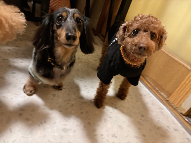 おっとり柔らかい雰囲気のトイプーちゃんと、社交的なダックスちゃん。静かにごあいさつや