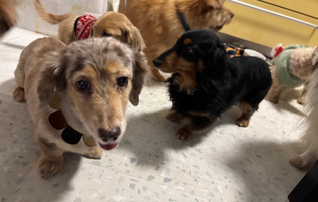大人しい子たちとはクンクン交流できました。後ろにいる赤い服を着たベテランダックスちゃん