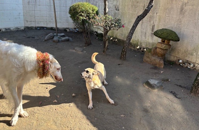 人間よりわんこが大好きなミックスちゃん、先輩ボルゾイくんが来ると、シッポフリフリ