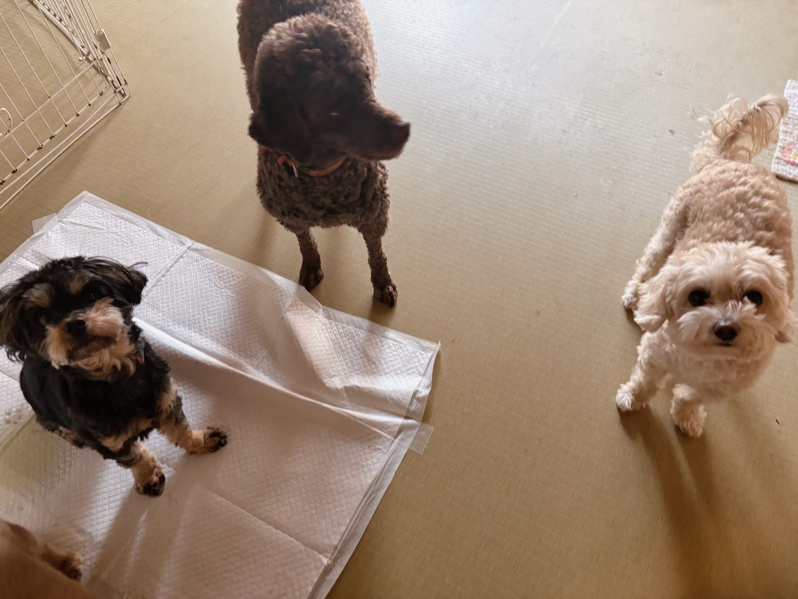 お泊まり組の子たち、クンクンあいさつ大会をしていたところ。のんびりマイペースミックスちゃんに、いつも陽気なドゥードルちゃん、ヤンチャチームのミックスちゃん、いつものベテランさんたちも…今日もいろんな顔ぶれさんたちが集まって、ワイワイ交流をしてくれています。お互いはじめましてだったり、いつもの馴染みの顔だったり、出会いのカタチもいろいろなので、相手によって交流の仕方もそれぞれ。ちょっと慎重モードもあり、リラックスムードでお話しすることもあり。感じ方も多種多様なので、コミュニケーションの良い練習にもなりそうですね。