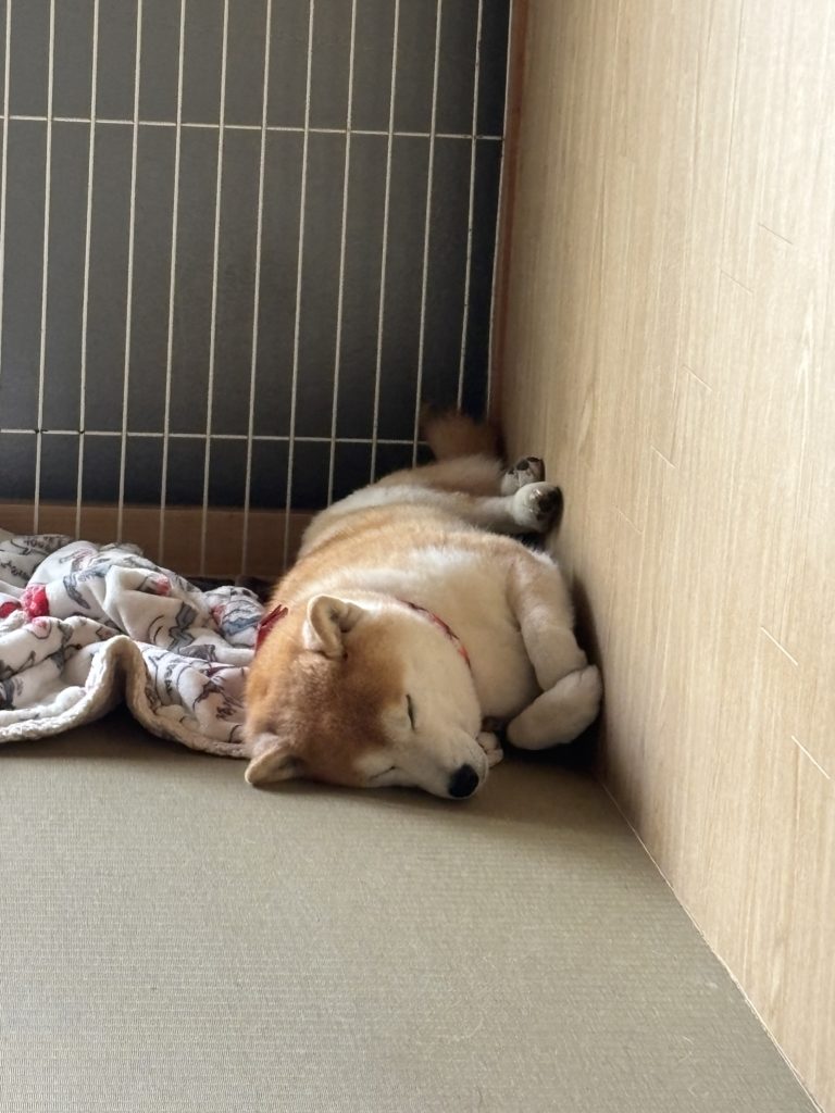 今日もいつものコーナーゾーンで、いつものお得意のポーズで、お昼寝をしている柴姉さん。ちいちゃくおたたみした前足と、トレードマークのサンカク耳、気持ち良さげな表情がなんとも言われぬ味わいを醸し出しております。絶妙に半分仰向けになりながら、壁の巧みな使い方にもご注目(笑)
