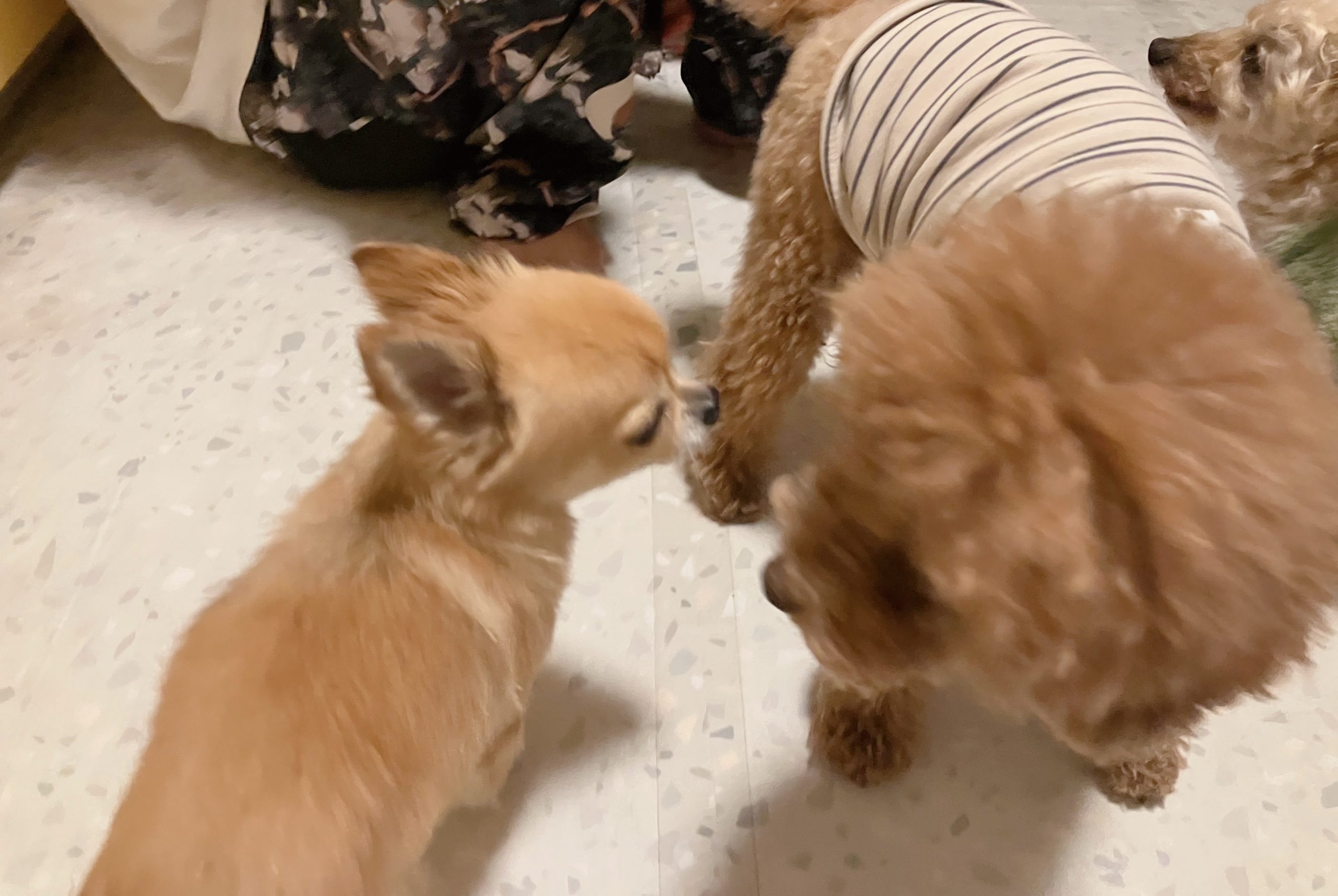 控えめタイプのチワワさん、数日滞在している間に、だんだんと慣れてくれて、みんなと少し交流もできるように。最初は慎重に距離をとりながら、大丈夫そうだと分かるとトコトコ近づいて、控えめにクンクンクン。相手のトイプーちゃんは慣れっこさんなので、優しく受け入れてくれたようで、無事交流ができたみたい。最初は戸惑いや緊張もたくさんありながら、でもちょっぴりずつ進歩していく姿は、とっても健気で犬のたくましさもあり、スゴイものだなあと、いつもながらに感心するのです。