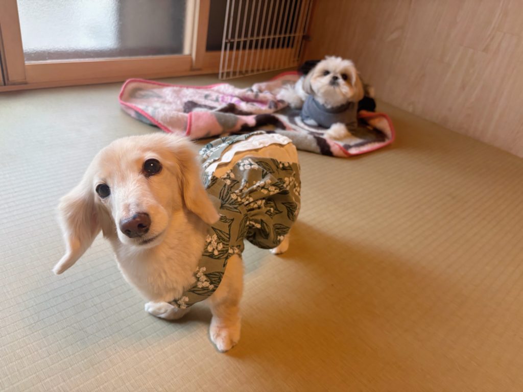 ダックス&シーズーお嬢様たち。おふたりとも、いつもガーリーなお召し物で、わんこのうちの
