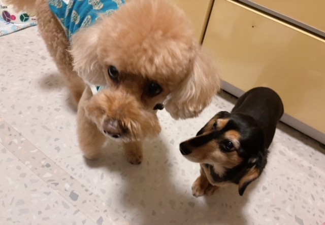 トイプー先輩はくりっとしたおめめで見上げ、人間の動きをチェック、そばにいた控え目ダックス