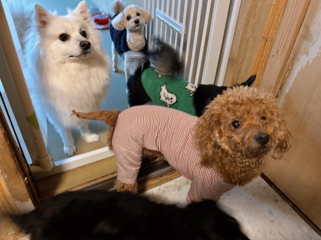 ベテランさんたち、新しくお泊まりに来た子の気配を察知…?入り口付近に集まって、ちょっと集中モードに。わんこたちのセンサーは本当に敏感なので、新入りさんが来ると一気にそちらに意識が向きます。そして、お部屋に入ってきたら、まずはクンクン入念なチェックから始まり、会ったことあるかなあとか、どんな子なんだ?といろいろと情報を得ようとします。一緒に過ごす相手ですから、それはチェックも真剣になりますね。