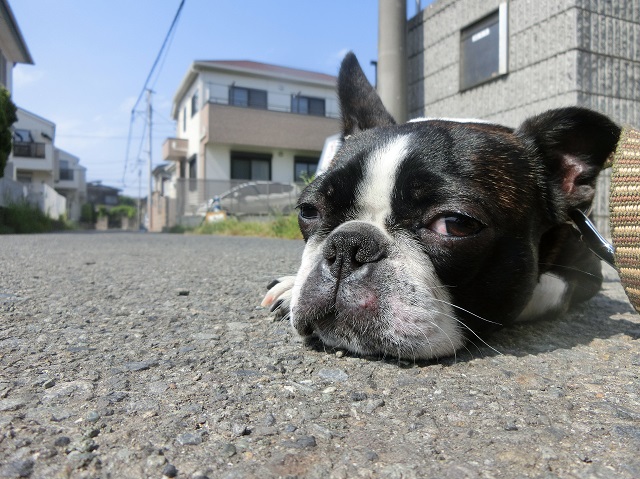 <お散歩たくさんしよう、湘南茅ヶ崎のペットホテル>絶妙 店舗ブログ 2015.05.13 「地面とわたし。は~。少し暑い…」 お散歩途中、道にぺたんと伏せてしまいました。「少し疲れた。」そうです。それにしても、この何とも言われぬ表情!特に目の半分さ加減はなかなかマネできるものではありません。”愛嬌”とはこのことを言うんですね。 湘南のペットホテル、毎日わんこたちのいろんな表情が見られて、ますます魅力的に感じるばかりです。