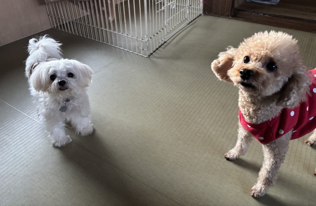 朝の日課を終えて、さあ後は何をする?の瞬間。人間の動きもチェックしつつ、特に何もなさそうムードを感じ取ると、またそれぞれ、マルチーズちゃんは相方さんと一緒に座ってみんなの様子を眺め、トイプーちゃんはお布団ゾーンに戻って二度寝タイム。お二人ともわんこのうちはだいぶ慣れてくれているので、自分の過ごし方もちゃんと心得ているみたいですね。通いチームやお泊まりの子たちが来るまでの間は、一日のうち一番静かなひとときなので、各々好きなだけ二度寝をしたり、まどろんだりしてもらいます。なにしろ、ココロも身体も落ち着いた状態が一番大切ですし、いろんな交流もスムーズにできますからね。