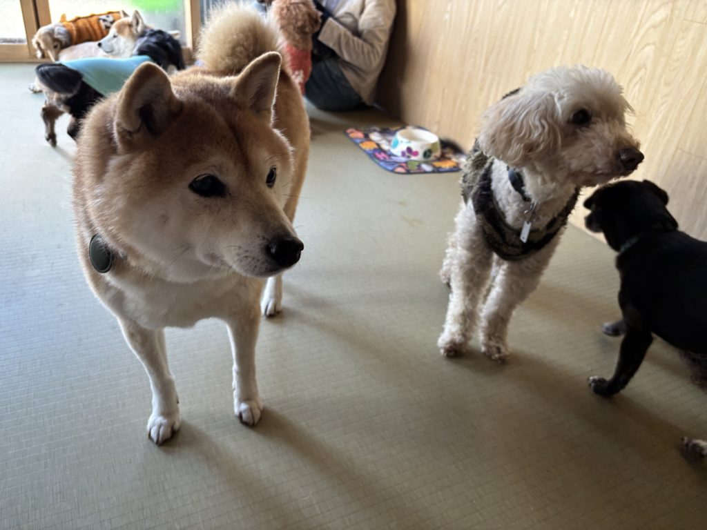 シニアチームの柴さんとトイプーさん、向こう側に誰かの気配を感じたのか、しばし集中モードに。お耳センサーを敏感に働かせて、何かを感知しているのでしょうね。