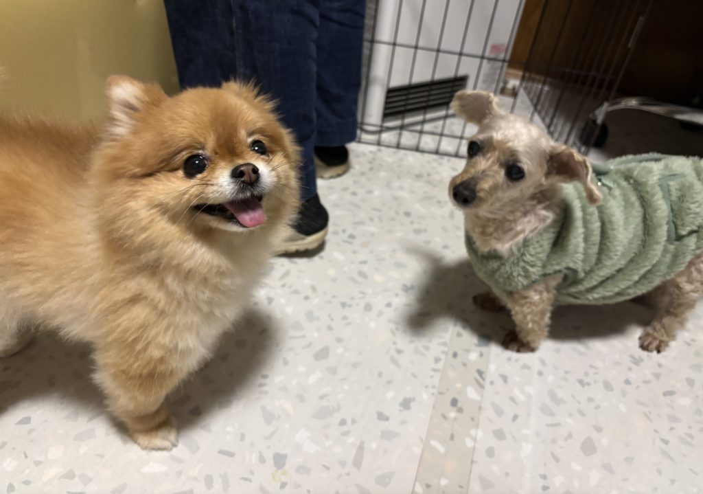 とってもキュートなポメちゃんとトイプーちゃん。くりくりおめめで見上げながら、人間にリポートもしてくれました。