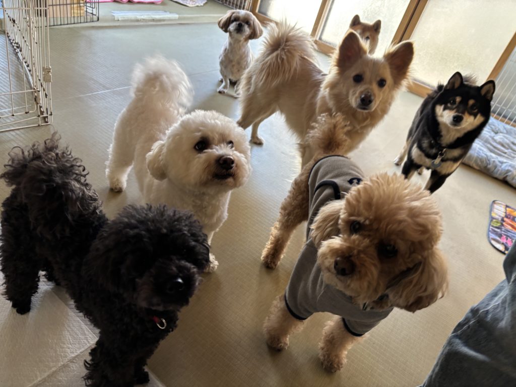 お泊まりや通い組の子たち、みなさん一同に集まっております。人間の動向もみんなで観察しながら、それぞれ何を期待したり考えているのでしょう。ちょっぴり真剣な表情がまた何とも愛おしいです。