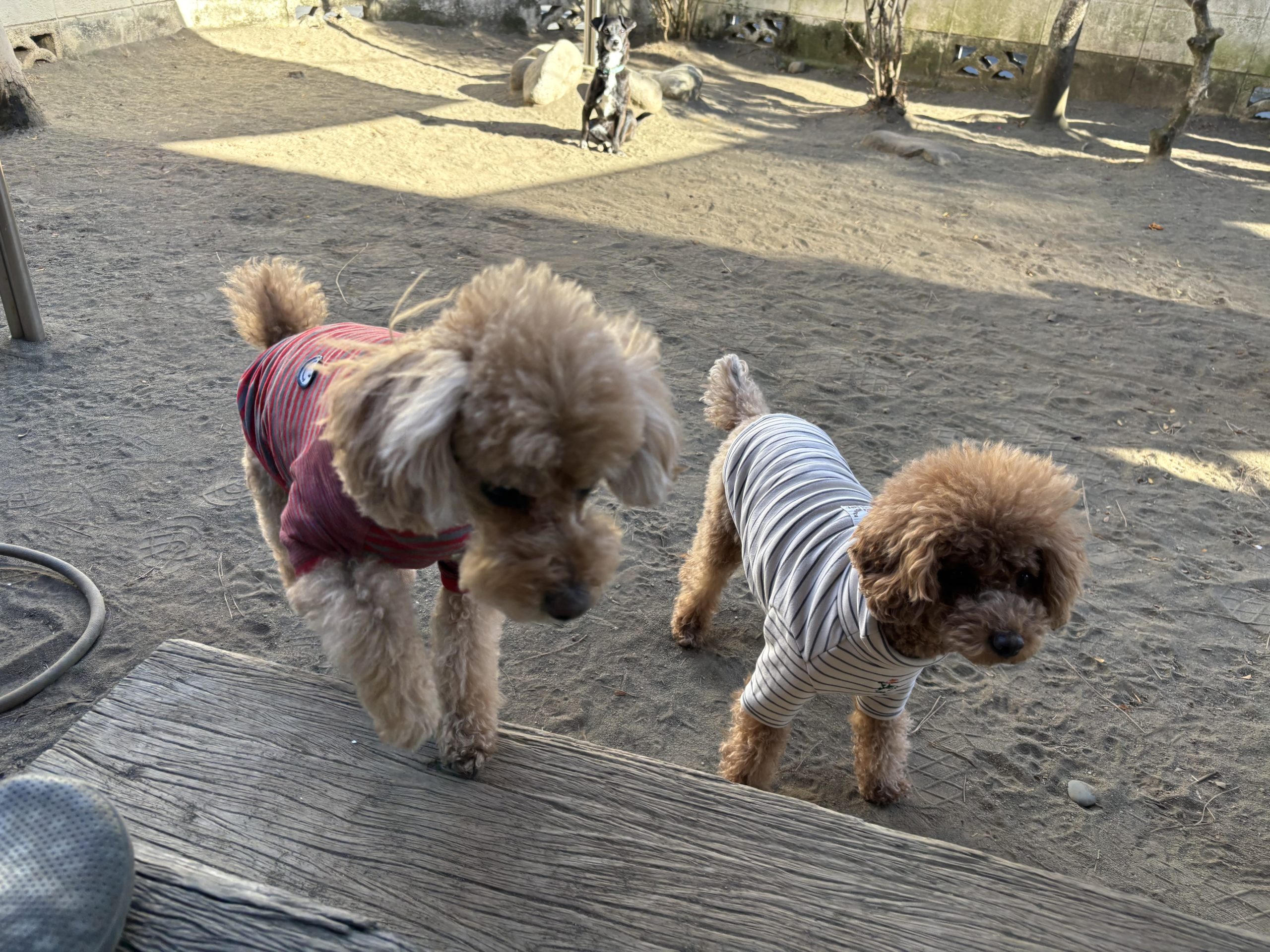 気ままなお庭散策を終えて、トコトコ枕木ゾーンまでやってきたトイプーさんコンビ。申し合わせたように、おふたり素敵な色違いのボーダーお洋服で^_^のんびり空気も漂わせながら。