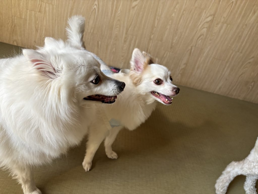 横顔が何となく似ているスピッツちゃんとチワワちゃん。おふたりとも口角がグイッと上がって、何だか楽しそう。それもそのはず、チワワちゃんはミックスちゃんと遊び仲間になり、いつも天真爛漫なスピッツちゃんは、とにかくなんだか嬉しそうな表情をしてくれる笑