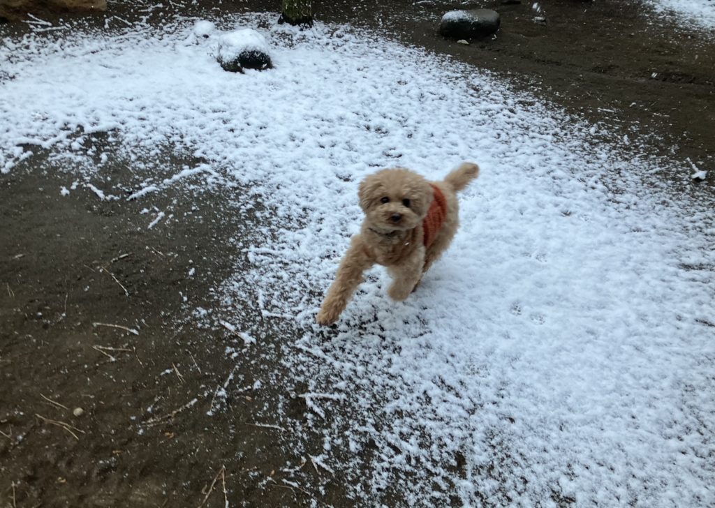 茅ヶ崎でも久々の雪が降り、お庭にもだんだんと白い景色が広がっております。キリッと冷たい空気の中、わんこたちは果敢にお庭へ。トイプーちゃんもちょっとテンションが上がって、ルンルン小走り。その姿はなんだかウサギさんのようで(笑)とっても微笑ましくキュートです。他の子たちもくんくん雪の匂いを嗅いだり、いつも通り気ままに散策したり。