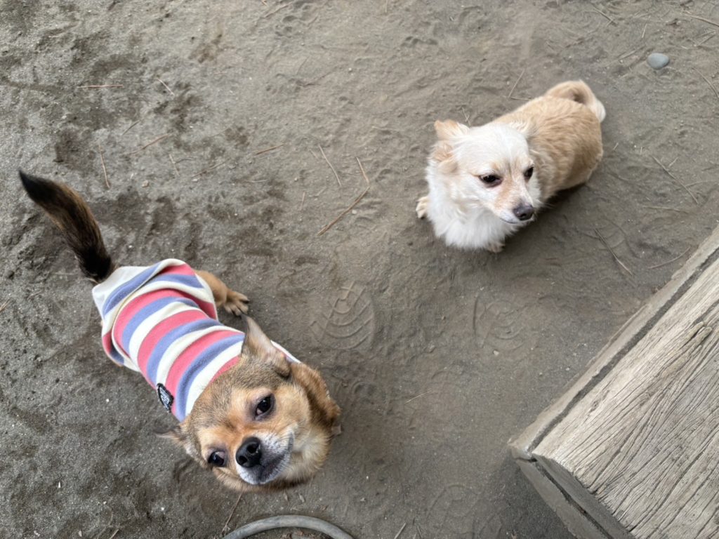 お久しぶりに来てくれたチワワちゃんとミックスちゃん、気ままなお庭散策を終えて、そらそろお部屋に戻ろうかな、という事で、枕木ゾーンに何となく佇んでいるところ。ここでじっとしていたり、人間をウルウルの瞳で見つめたりすれば、自動的にお部屋に戻れる、ということをちゃんと熟知しているような(笑)お二人の絶妙な表情が、なんとも可笑しくて可愛いですね。