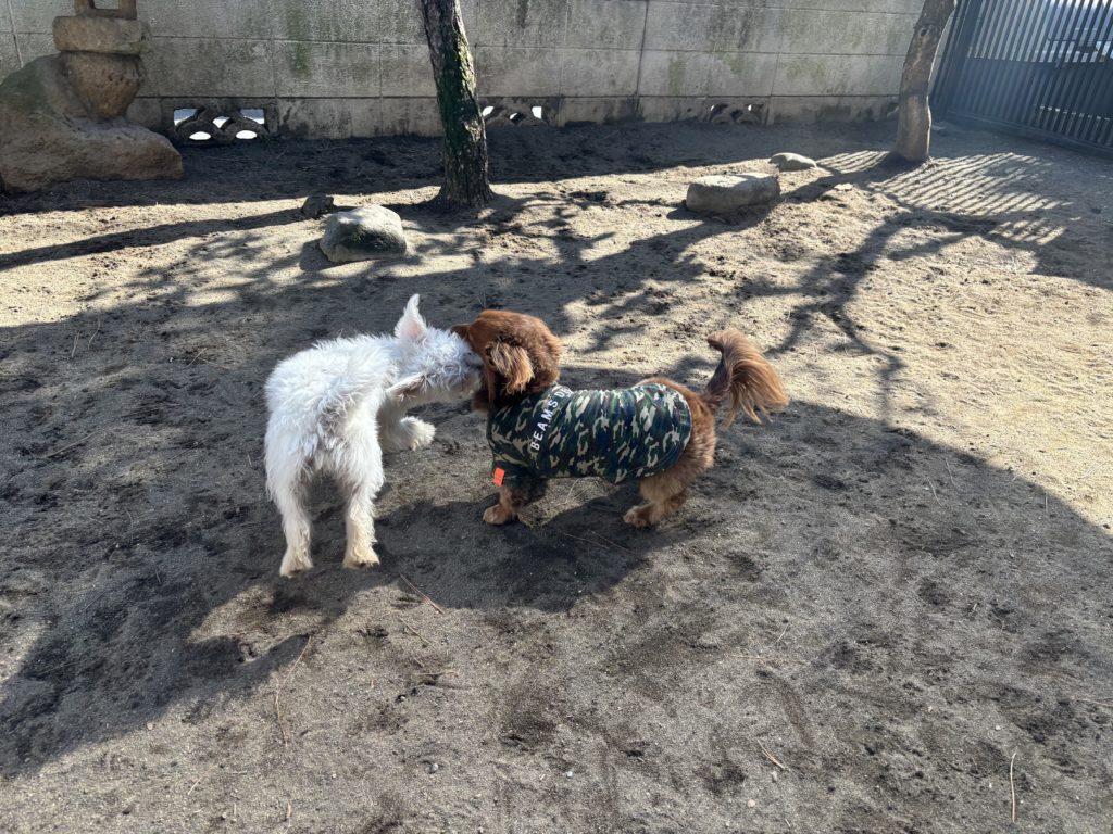 初対面ながら、すっかり仲良く遊び仲間になったミックスちゃんとダックスちゃん。お庭では縦横無尽に走り回り追いかけっこ、時々クンクンしながらプロレスごっこも。二人とも、さすがお若いだけあって、躍動感もたっぷり、嬉しさや楽しさを身体いっぱいに表現しながら遊ぶ姿は、なんとも犬らしく清々しい。わんこ同士でしか出来ない遊び方がありますし、身体で犬社会のルールも知ることが出来たり、良い学びもたくさんあります。そして何より、気が合ってたくさん遊べて良かったね、と見ているこちらまで嬉しくなりますね。