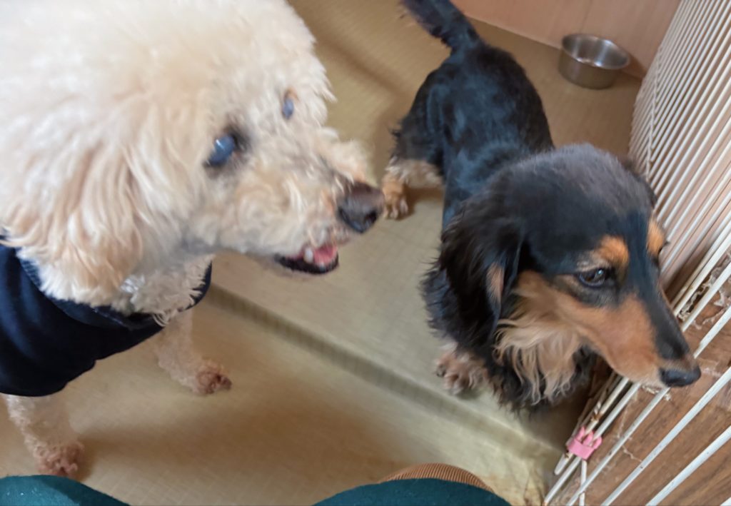 控えめダックスちゃんは、何やらお部屋の向こうの動きが気になるようで、しばし静止して、いろんなセンサーを働かせながら観察しているみたい。トイプーちゃんは、好奇心旺盛な慣れっこさん、なになにー?と近づいてきて、鼻センサーを稼働させながら、ついでにダックスちゃんにも話しかけてみたり。わんこたちが持っている感覚は本当に鋭くて、またそれぞれにセンサーが働く場面も違ったりしているので、見ていても面白く興味深いものです。何を確認しているのか、何に対して集中力を働かせているのかは、ご本人にしか分からない部分もありますが、その時の表情は凛々しく、犬らしさを感じさせてくれます。