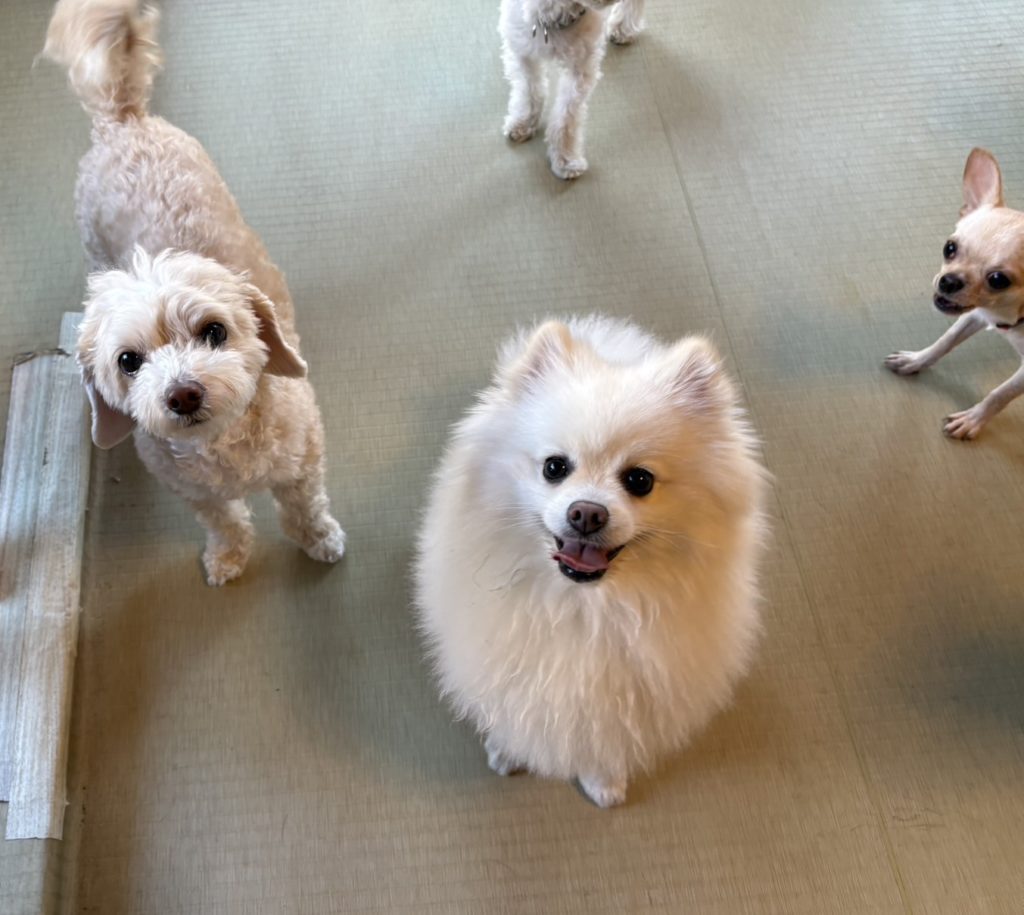 いつも天真爛漫なポメちゃん、早速メンバーチェックをしながら、元気にお部屋をウロウロ。お久しぶりの子もいたり、また会ったね、な子もいたり、はじめましてーな出会いがあったり。いろんな交流のカタチがありますが、そこは慣れっこさんだけあって、ご陽気ムードでこなしておりました。お隣にいるミックスちゃんはさらに先輩、すっかり落ち着いた表情で、ごあいさつもさらりと済ませて、あとはひたすら人間に甘える(笑)
