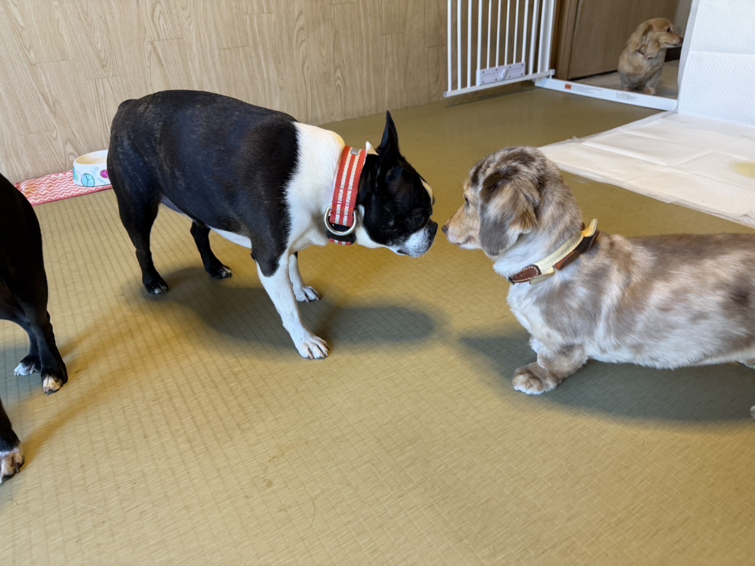 穏やかさんなボストンちゃんとダックスちゃん、優しくクンクンごあいさつ中。以前にもあったことがあるような、ないような?匂いの記憶を辿りながら、お互いに安心確認をしているみたいです。