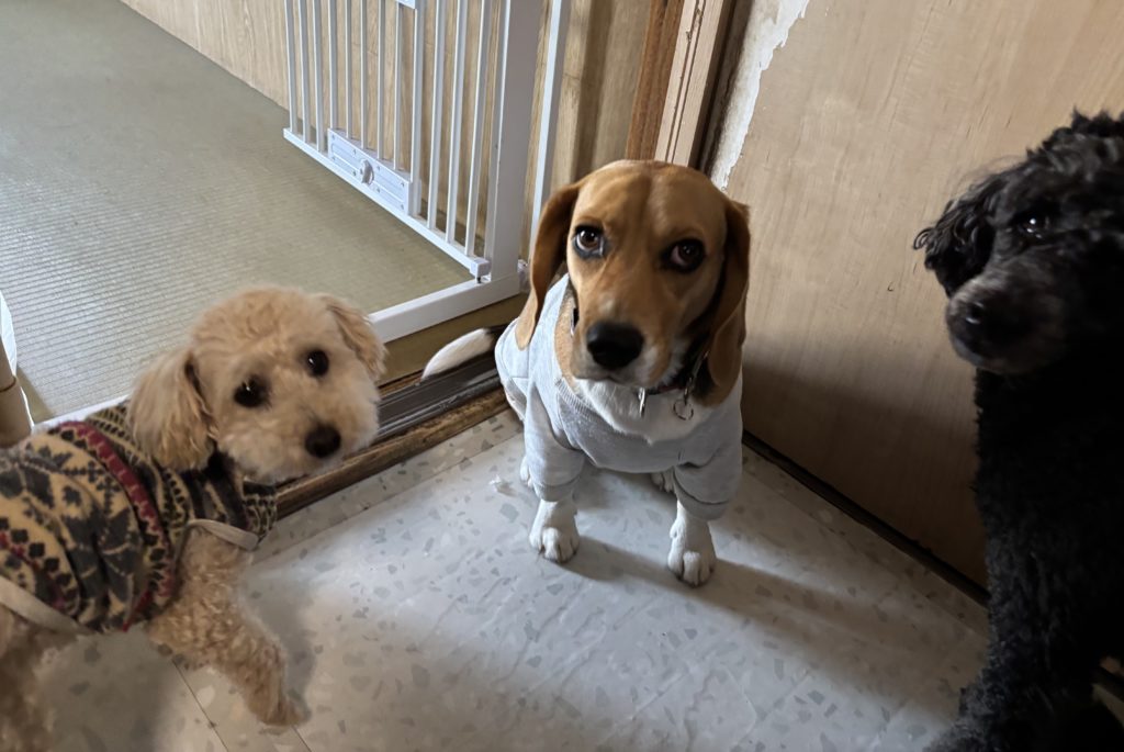 お泊り組や通いチームのお三方、バッチリ目線もいただきました。みんな、何度か顔を合わせたことのある仲間同士、クンクンごあいさつをしたり確認をしながら、上手に過ごしています。