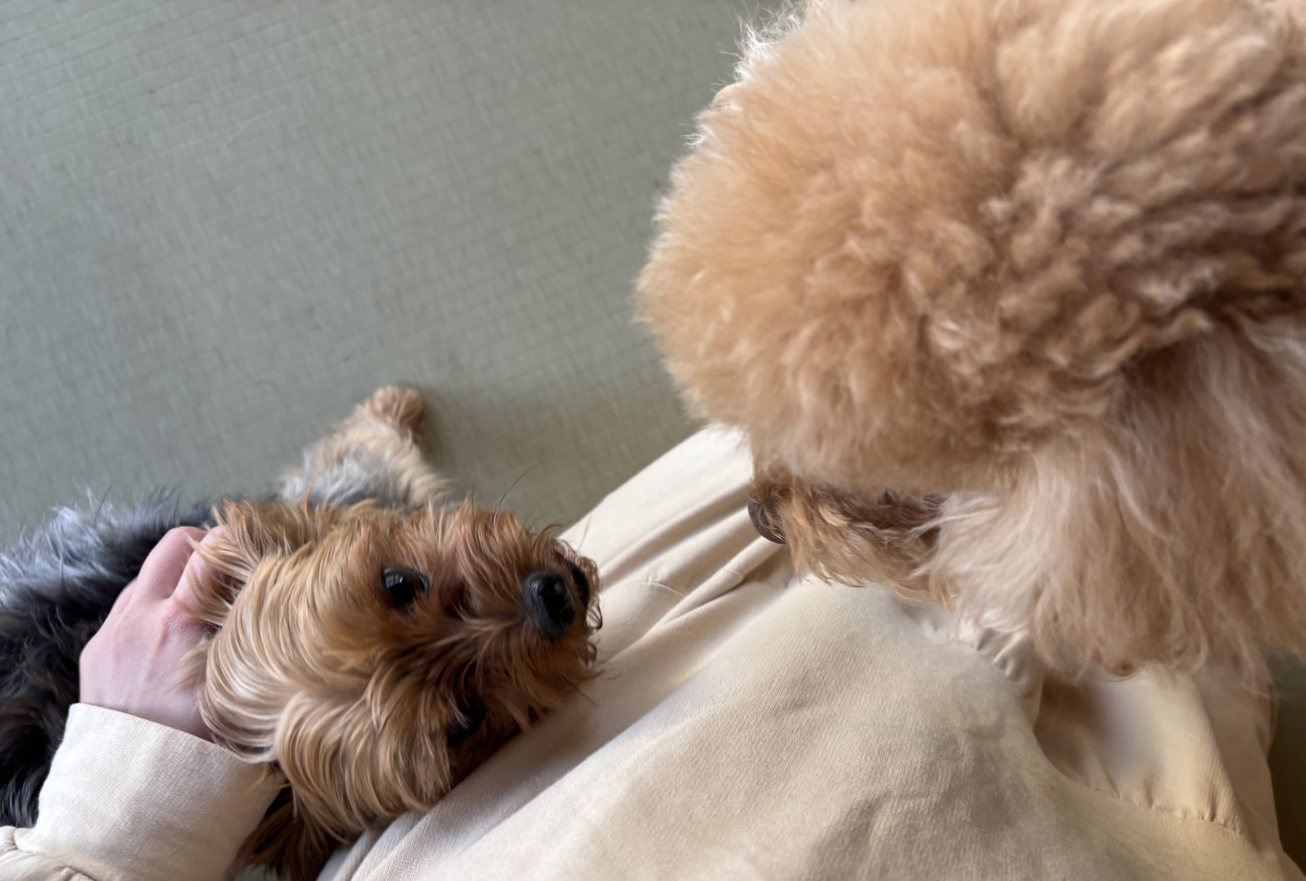 新しく仲間入りしてくれたヨーキーちゃん、人間にくっつきくっつき、体をくねくね、なでなでタイム。先輩のトイプーちゃんも、そんな姿を見て負けじと(笑)甘えモードになり、しばしのスキンシップを。人間のことが大好きで柔らかい雰囲気のヨーキーちゃん、先輩たちともすぐに打ち解けてくれて、トロンとした表情がなんとも愛らしいです。