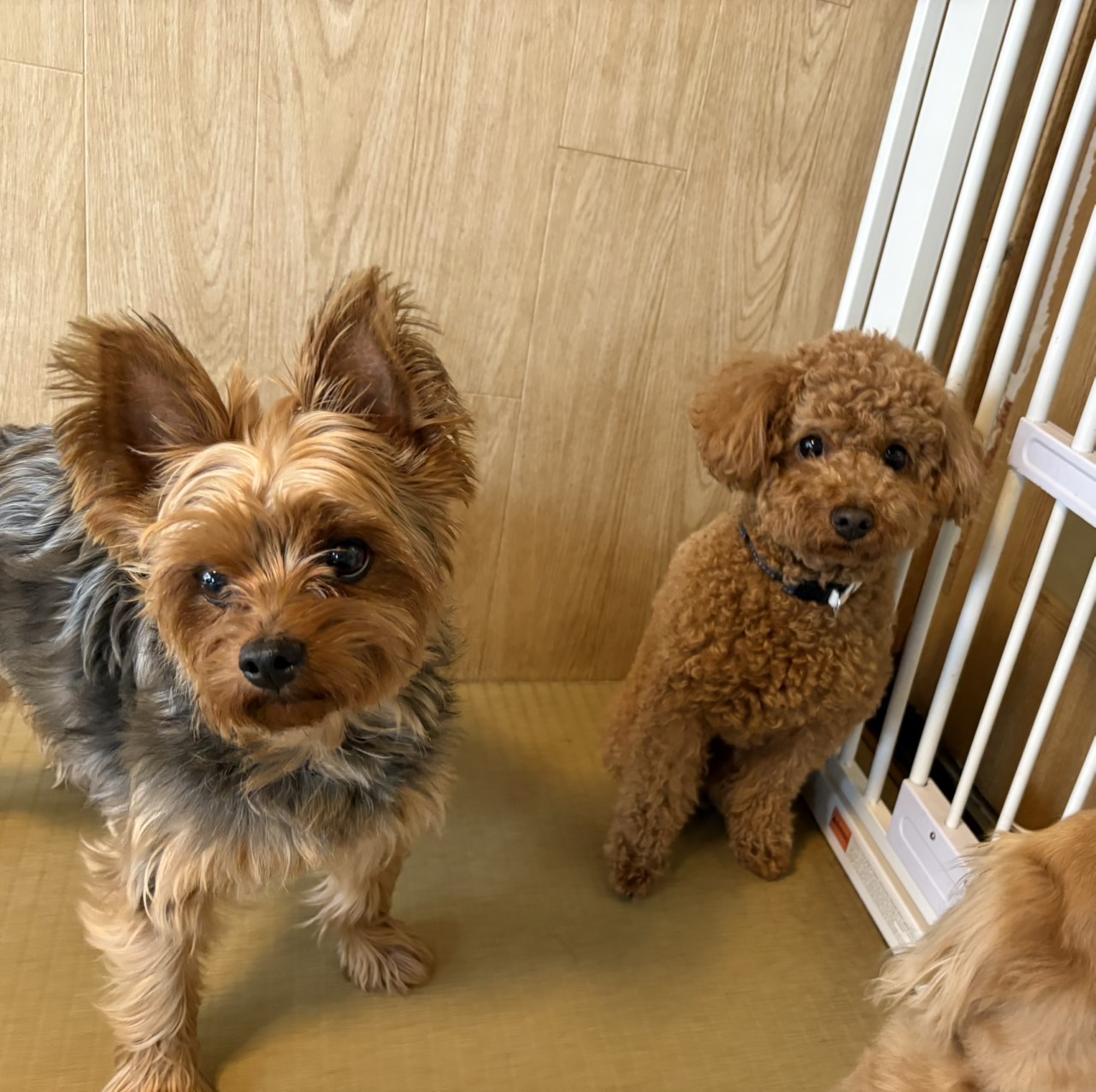 まんまるなおめめで、ちょっぴり真剣に見つめるヨーキーちゃんとトイプーちゃん。数日一緒に過ごしてきたので、すっかり落ち着いて安心している様子。ごあいさつも一通り終わったし、お外はあいにくのしとしと雨なので、あとは…お部屋でゴロゴロしながらお休憩タイムですかね、といったところ。いつもの日課でもあるので、先輩たちはすでに自分の場所を確保してまどろみモード、新入りさんもそんなゆる〜っとした先輩たちの姿を見ながら、まったりとした空気の中で、各々のんびりタイムを満喫。みんなで同じ空間を共有しながら穏やかに過ごすひとときが、やっぱりありがたいね、としみじみ思わせてくれる、ここにしかない貴重な時間を運んでくれるわんこたちには、感謝感謝なのです。