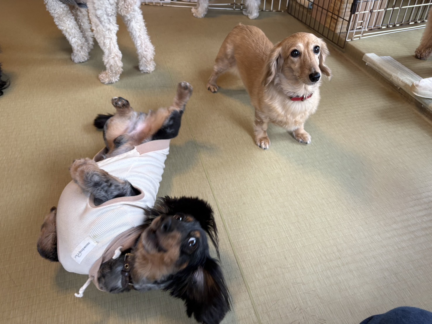 ダックスちゃんがいつもの得意技をご披露。身体をクネクネさせながら、お顔はしっかりこちらを見つめて(笑)上手でしょ?と言わんばかりに。そして、なでなでも期待しながら。お隣にいたダックスちゃん、少しキョトンとしたお顔で佇んでおりますが、実はこの子も仰向けゴロゴロが得意。お二人は気心も知れて仲良し同士なので、この後ふたりで人間のなでなでタイムをしっかり満喫しまして、いつものまったりムードを大放出。ベテランさんたちのこうしたユルユル〜な雰囲気は、お部屋全体を柔らかくしてくれるので、とても大事なひとときなんです。そして、自然とお互いの絆も少しずつ深まって、より豊かな時間を過ごすことができますね。