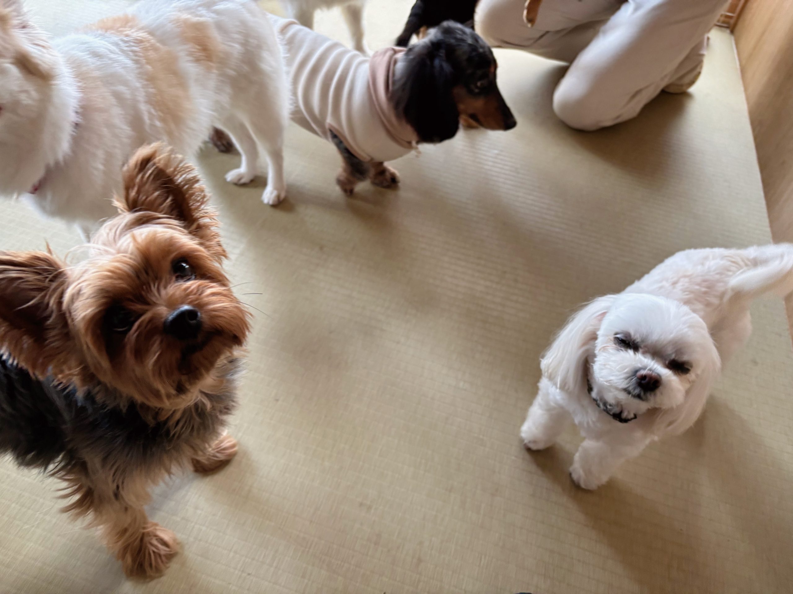 みんなでのんびりくつろぎタイム、甘えっこのヨーキーちゃんはおめめをクリクリさせながら、”なでなでとか抱っことか…”とちょっと期待の眼差しで。お隣にいたお元気なマルチーズちゃんは、だいぶアクティブに活動していたので、いよいよ眠たくなってきた?お二人の対照的な表情が、とても面白いですね。