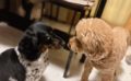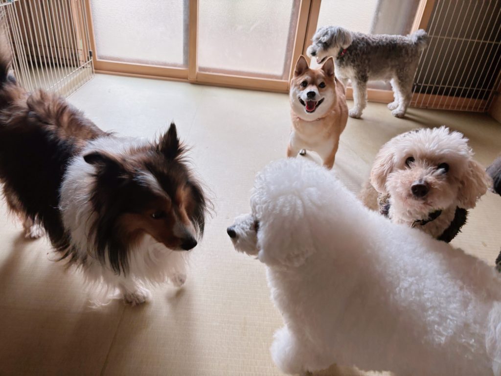 ベテランシェルティーちゃんと新入りのビションちゃんがはじめましてのごあいさつ。そして、ひょっこりとお顔をのぞかせているベテラントイプーちゃんはこちらを見つめ、そのまた後ろでは柴ちゃんやシュナちゃんがウロウロ…それぞれにいろんな心境や目的がありそうですね。