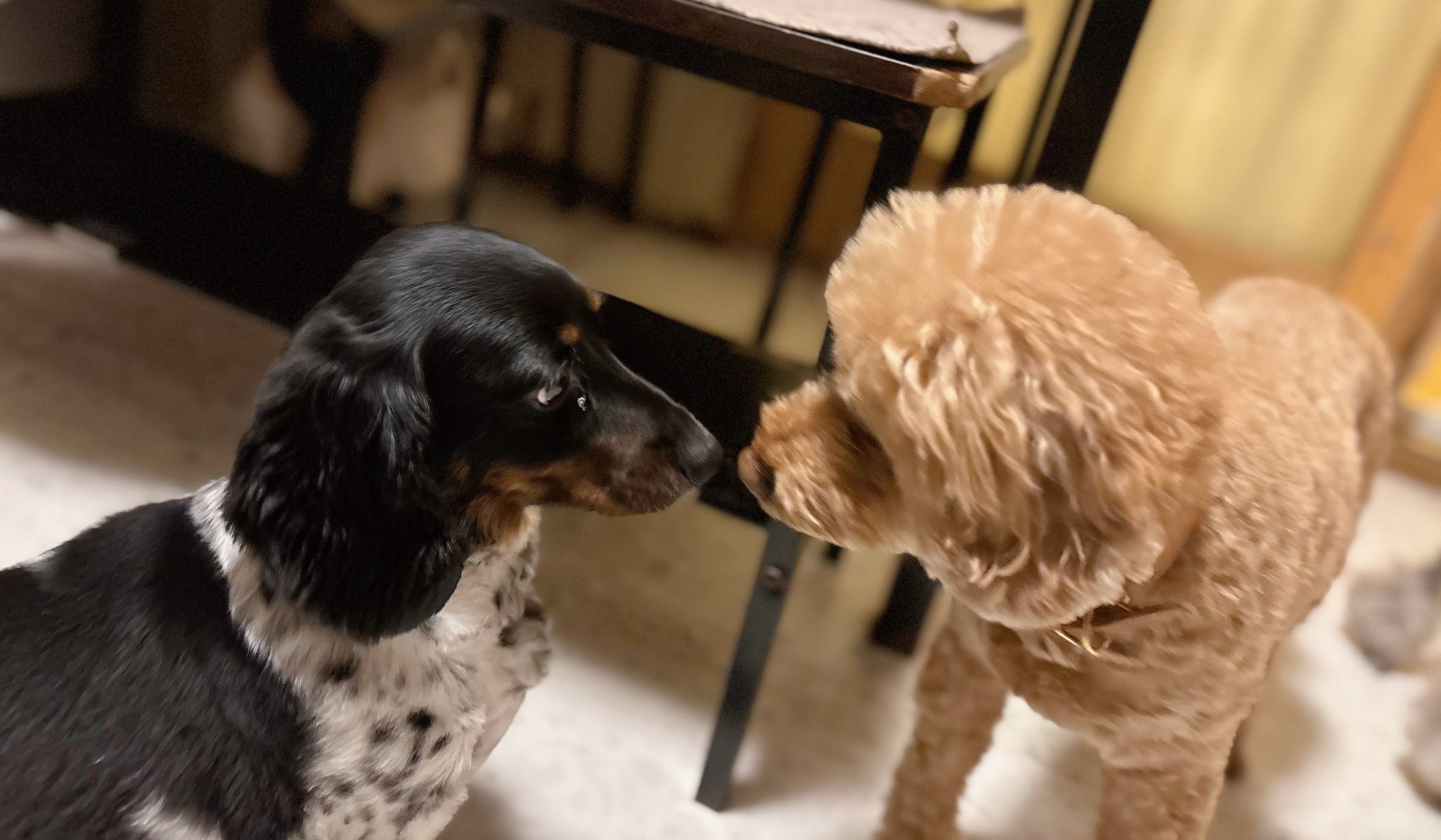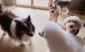 お鼻を近づけてクンクンしながらお話し中のダックスちゃんとトイプーちゃん。ダックスちゃんは、いつも控えめさんで、馴染むまでに時間が必要なタイプですが、お泊まりしている間に少しずつなれてくれたようで、優しいトイプー先輩とは上手に交流もできました。一体、どんなお話をしているのかなあ、なんて人間が勝手に想像を膨らませている間に、交流はすでに終わっていまして、またそれぞれ違う子の所にごあいさつに行っていました。切り替えもコミュニケーションもスピーディーな所が、なんとも犬らしくて、お互い安心確認が出来ればとりあえずOK、というあたりも、潔くて良いですね。