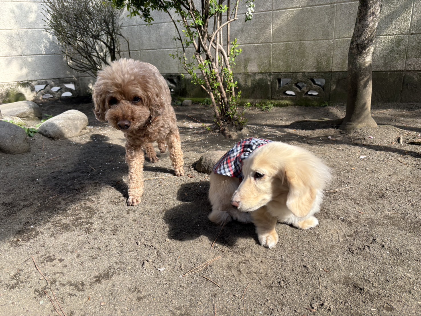 お久しぶりのお日様なので、わんこたちも気持ちが良さそう、マイペースさんなベテランおふたりも、気ままにお庭を散策中。軟体系女子代表のダックスお嬢様は、少し立ち止まって太陽の恵みをたくん頂き、トイプーちゃんは元気な足取りでいつものようにクンクンチェックもしながら。
