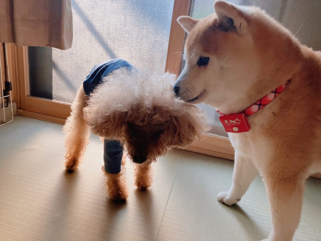 ハイシニアのトイプーさん、今日も一所懸命足を動かしトコトコトコ。近くでくつろいでいた柴ねえさんもやってきて、ちょっとごあいさつがてらクンクンクン。なんとも、ふんわりとした柔らかな空気が二人を包んでいて、窓から溢れる朝陽も優しく照らしてくれています。