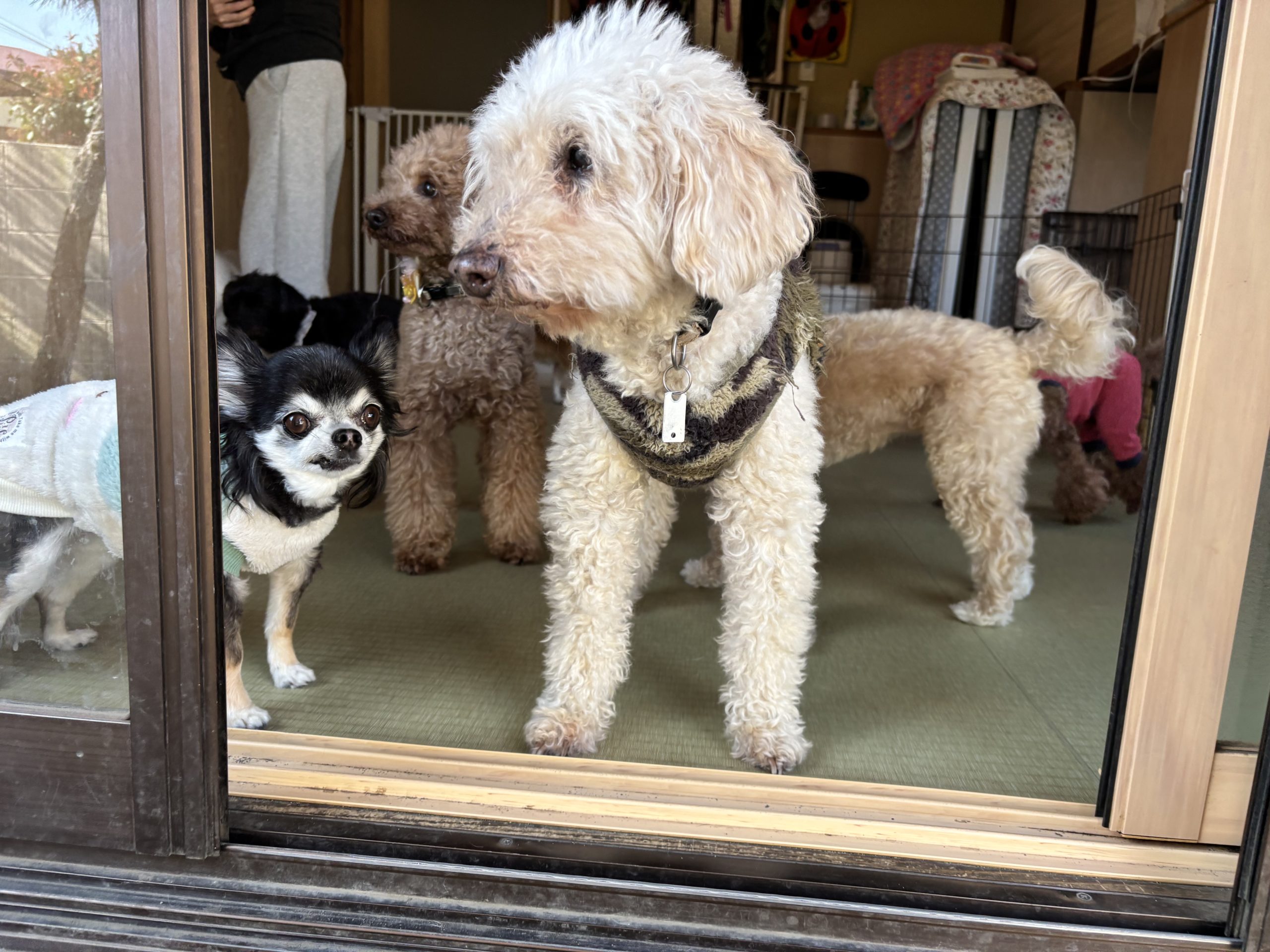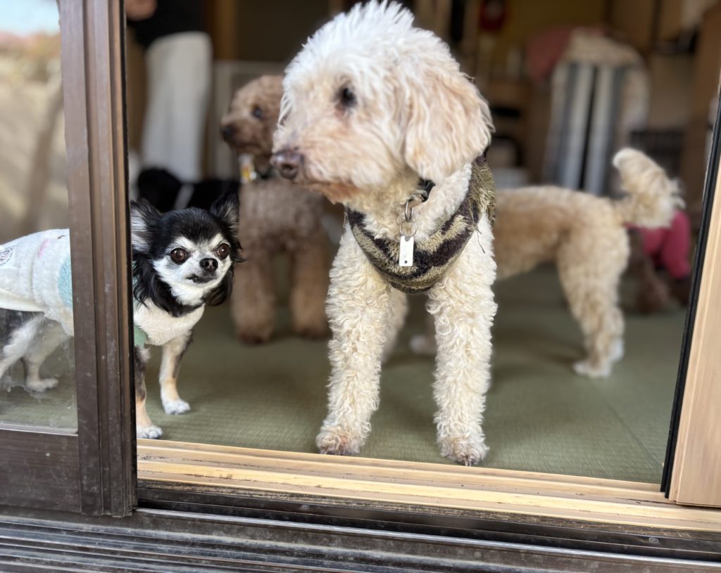 窓辺で佇むベテラントイプーさん、お外の様子を観察中。そこへトコトコトコ、同じくシニアチワワさんもやってきて、窓から入ってくる風に鼻センサーもピクピク。シニアさんならではの柔らかな雰囲気が、何とも心地良く。お庭は、まだ湿り気たっぷりだったので、とりあえずは窓辺で半身浴が良さそうだね、という事で、このまましばらくお外の風を感じながらリフレッシュタイムを過ごされておりました。