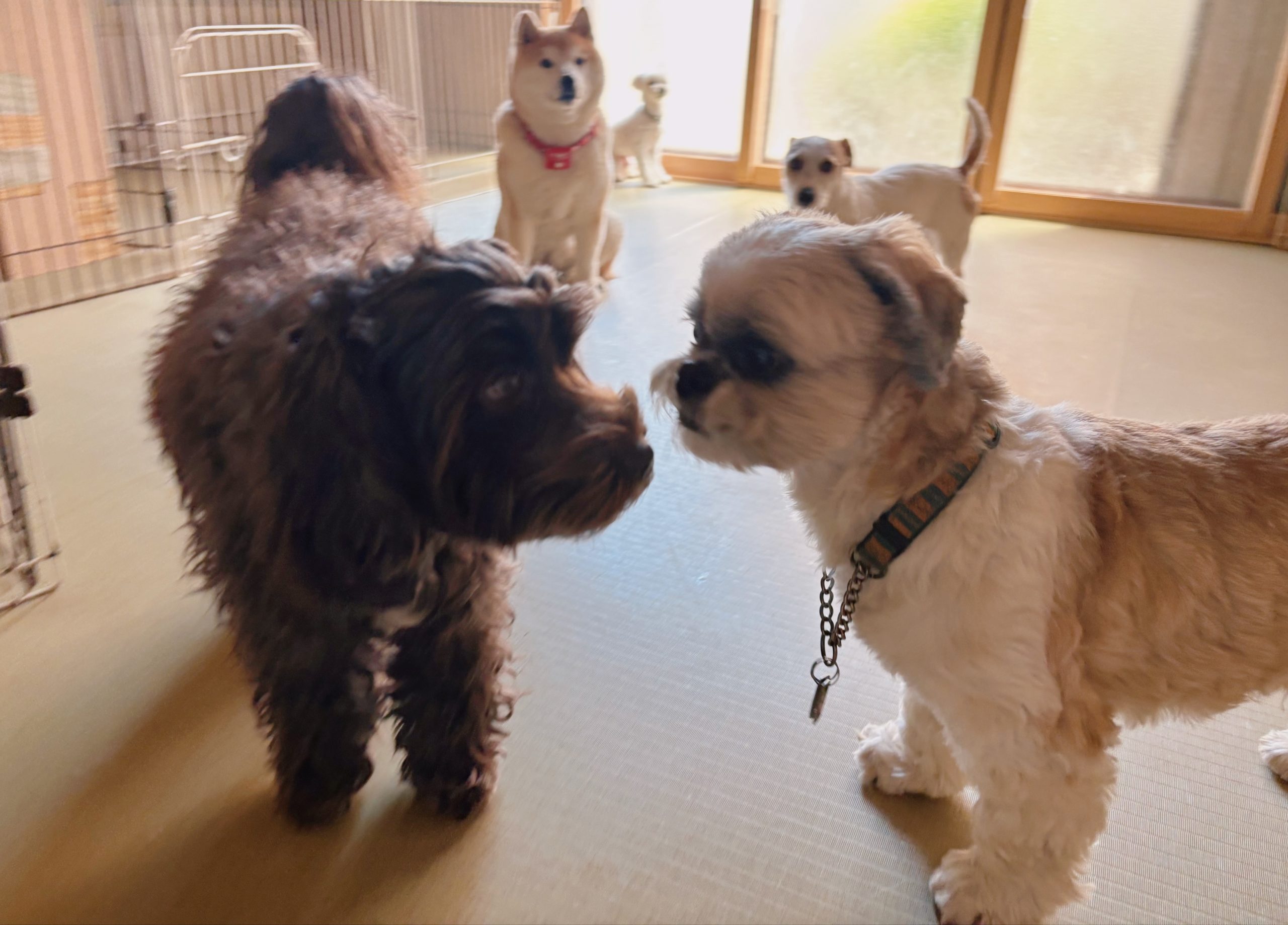 モフモフちゃんたちがクンクンお話し中。匂いの記憶を辿りながら、なんか知っているような、いないような…?お互いいろんな情報交換もしながら、ごあいさつをしていました。