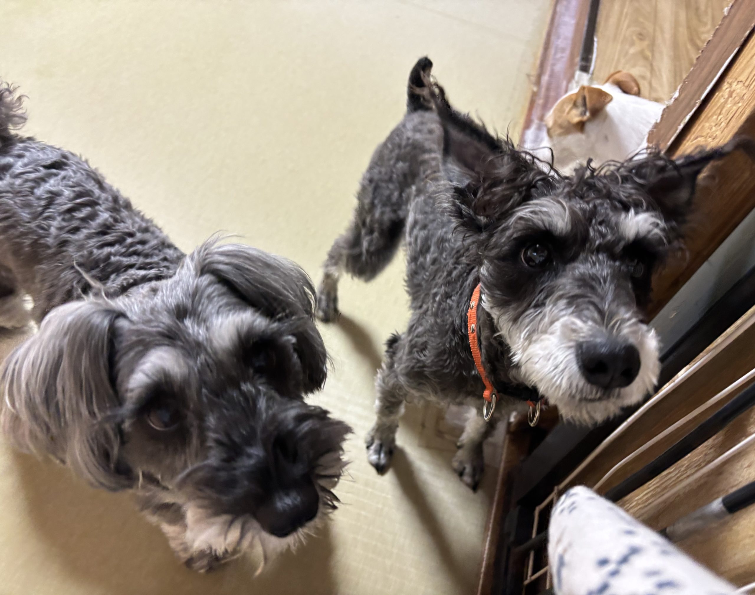 お泊まりチームのシュナちゃんコンビ、お顔を揃えて見上げていたところをすかさずキャッチ。お二人、同じ犬種だけれど、それぞれに違った魅力がありますね。