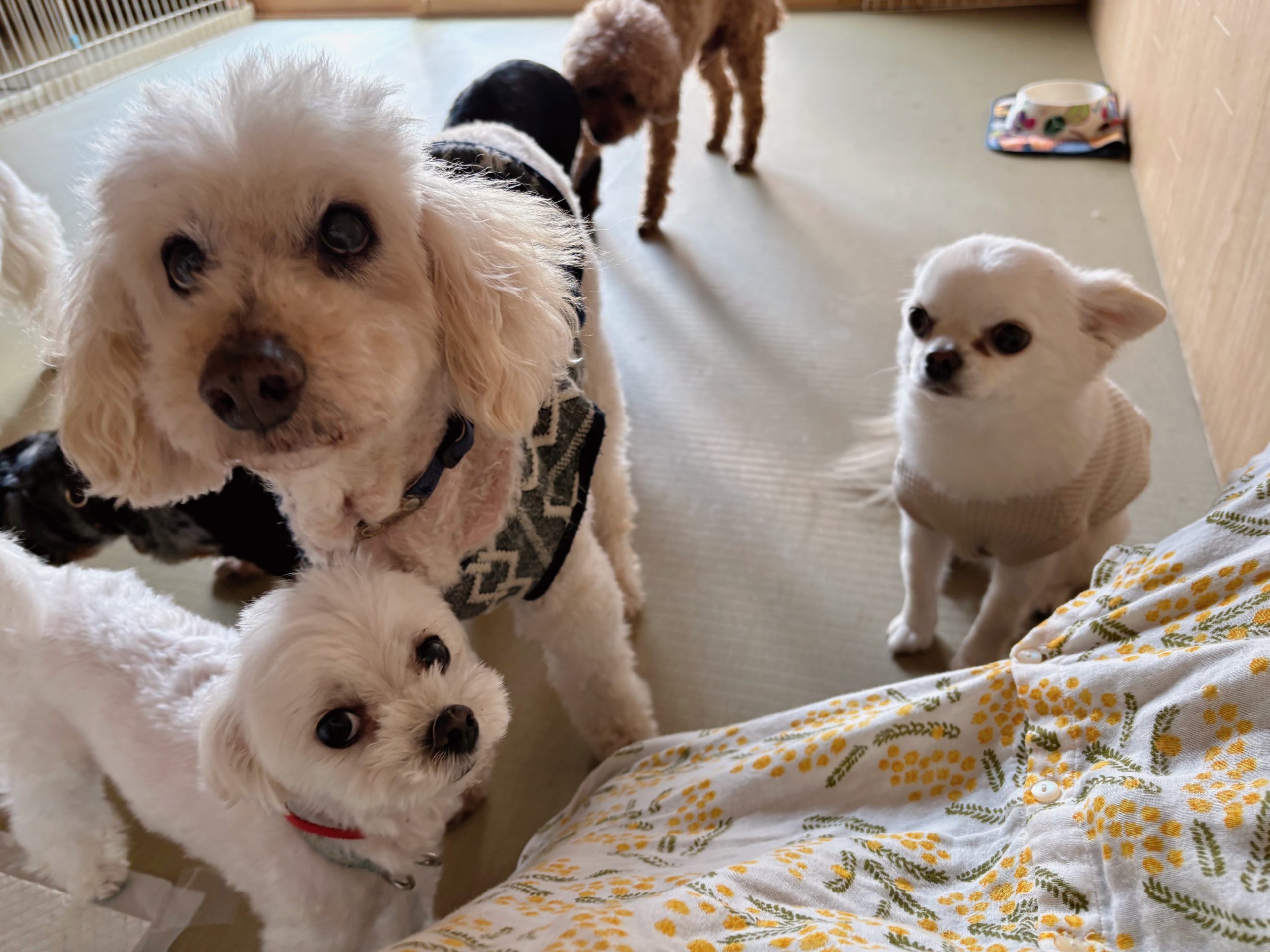 わんこのうちの”シロ白さんたち”が一瞬集まってくれたので、その瞬間をキャッチ。白い被毛に黒のおめめがクッキリと映えて、表情もとても分かりやすい(笑)チワワちゃんはいつものお耳ペッたんだし、長期滞在組のシニアトイプーちゃんとマルチーズちゃんは、上下の構図がなんともオシャレな感じ。それぞれ違った魅力を放っていて、お互いに緊張もない感じでとっても和やかムード。