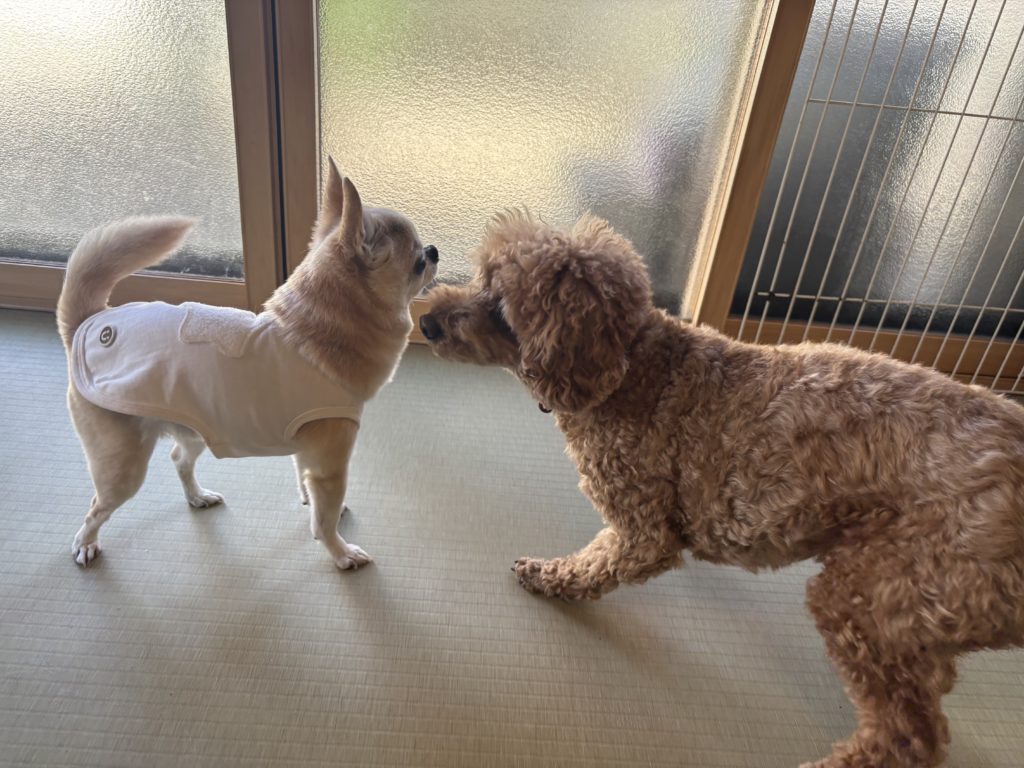 お久しぶりに来てくれたチワワちゃんと、常連ベテランチームのトイプーちゃん、気がつくと二人で遊びモードになっていました。シニアチワワちゃんはついさっきまでスースーお昼寝していたのですが、お昼寝から目覚めると、しばらくお部屋をトコトコ歩いて、ルームメイトたちともごあいさつしている間に、だんだん身体も起きてきたみたい。積極的にクンクンチェックをしたり、トイプーちゃんとは少しじゃれあいながら遊んだりも。普段はお二人ともまったりペースなのですが、たまにこうした一面も見られると、何だか嬉しいものですね。