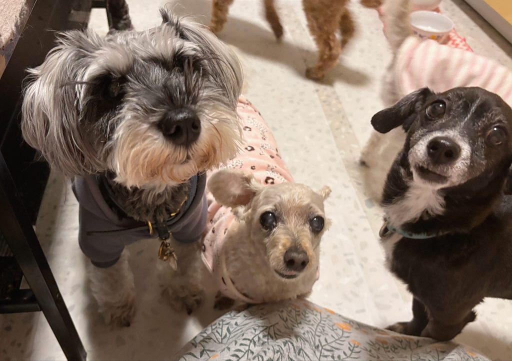 キュートなお顔が三つ並んで、くりくりおめめもいい感じ。人間が大好きなみなさん、ちょっと膝をおろすと、すかさず集まってきて、なでなで待ちを(笑)みんな可愛がられる術をちゃんと心得ておりますね。みんなベテランさんだから、人間とも信頼関係もあり、わんこ同士も緊張なくいられる仲間。