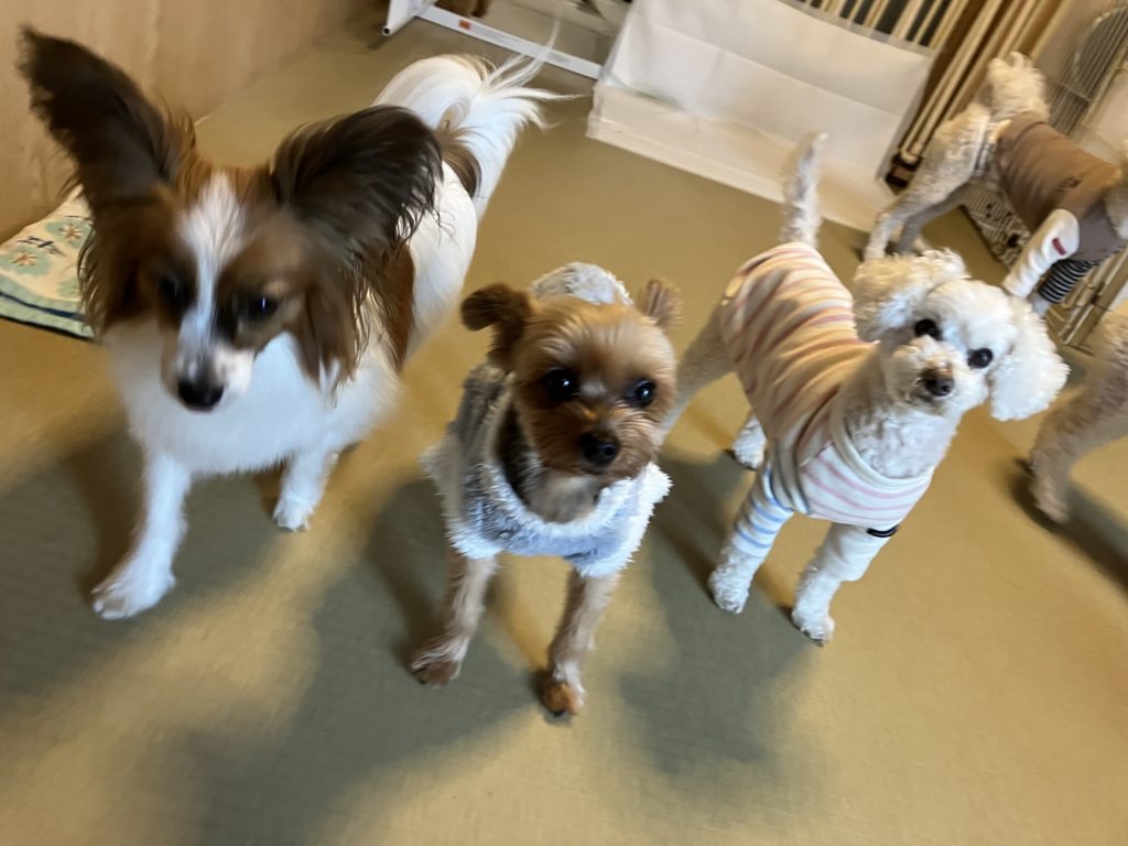 お泊まりチームのお三方、それぞれにいろんな期待や予測をしながら、人間を見つめております。ヨーキーちゃんとトイプーちゃんはベテランさんなので、大体流れも把握していて、おそらくはこんな感じかなあ、みたいな予測を出来ているご様子。新入りのパピヨンちゃんは、まだ少し戸惑いもありつつ、でも数日過ごす間に、少しずつわんこのうちペースに慣れてくれているみたい。先輩たちが超マイペースで、過度に干渉もしないから、きっと安心出来たのかもしれません。