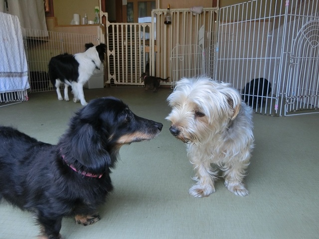 シニアダックスさんとお若いヨーキーくんのスローな会話。和みます。