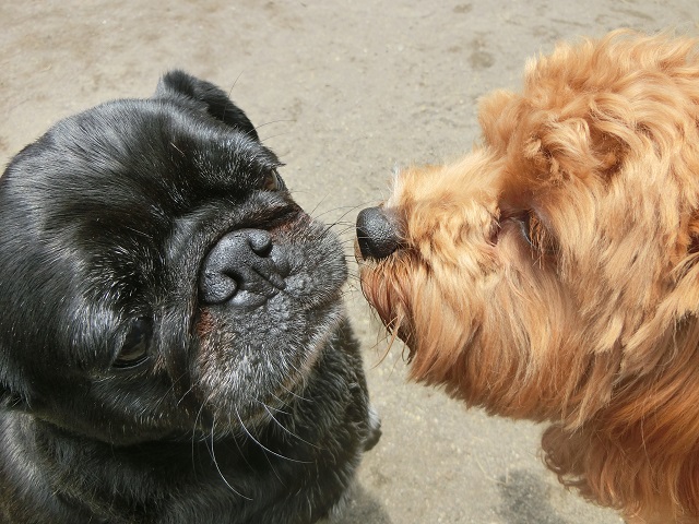 「大好きになりました!」「オイオイ近すぎません?」トイプーミックスちゃん、初対面でなかなか近づけなかったパグ先輩と、すっかり仲良しになれました。