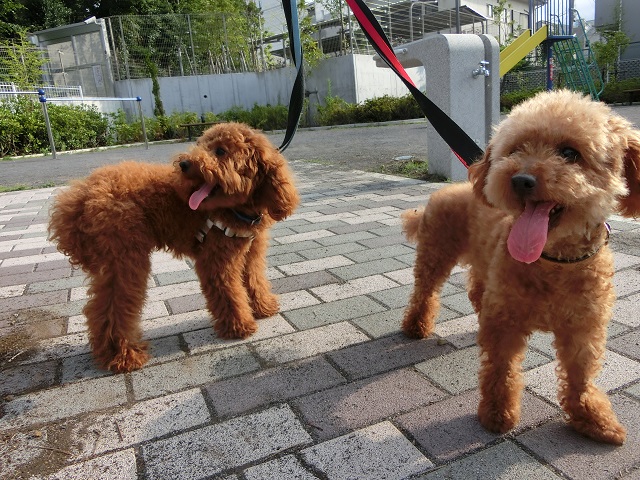〈わんこたちの憩いの場、湘南茅ヶ崎のペットホテル〉親睦 店舗ブログ 2015.06.22 トイプーズ、公園で休憩中。ふたりは違うお家の子なのですが、親睦を深めるため一緒に お散歩。歩くうちにだんだん歩調も合ってきて、軽快な足取り♪ 右の子は8歳のシニアちゃんですが、若い子にも引けをとらず元気元気(^^) やっぱり健康が一番ですね。そのためにもお散歩は欠かせません! いろんな子たちとの出会いのある湘南のペットホテル、今日もステキな時間を一緒に過ごしましょう。