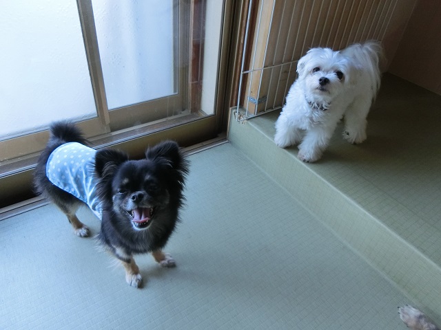 チワワちゃん、何か嬉しいことでもあったのでしょうか(笑)傍らにはクールな表情のマルチーズくん。