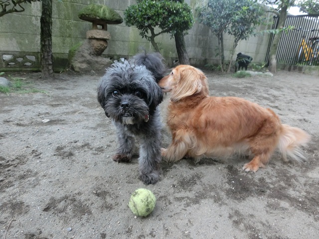 さらに大きくなってます!相方のダックスちゃんはボールもそぞろ、とにかくくっついて
