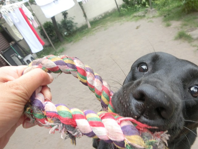 「つかまえたっ!!」大好きなロープで引っ張りっこ。