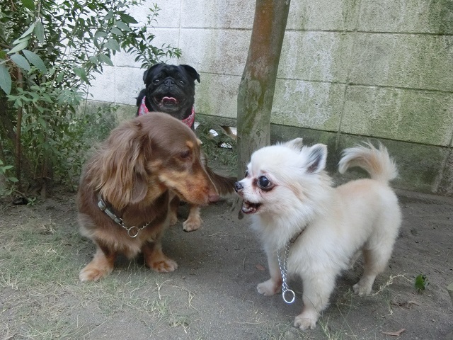 木陰で世間話をしているおふたりを発見。ダックスちゃん、真剣な表情で話を聞いてあげていますね。