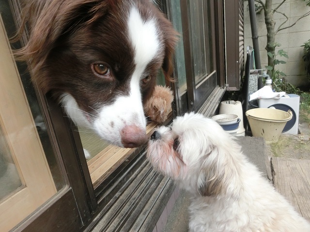 窓際でボーダーコリーくんとクンクンごあいさつ。マルチーズMixちゃんからしたら、とても